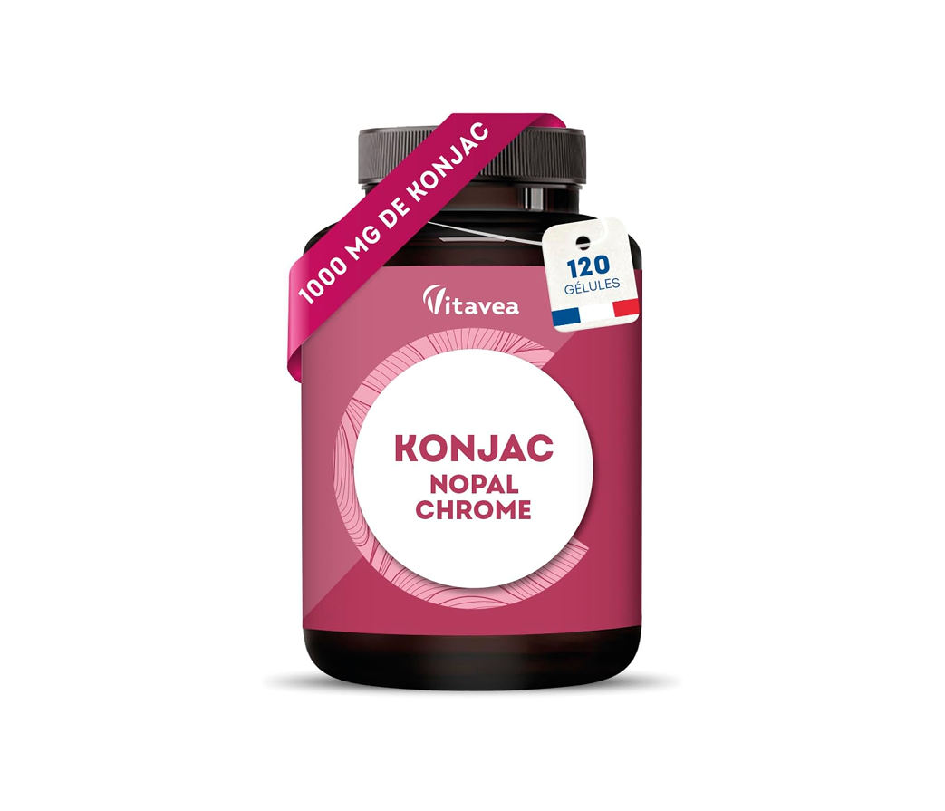 Vitavea Konjac 120 Gélules – 95 % Glucomannane avec Chrome & Nopal – Régulation de l’appétit, métabolisme et glycémie – Vegan, Fabriqué en France.